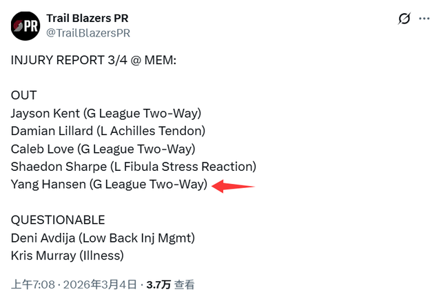 北京时间3月5日,开拓者官方在伤病名单上闹了个乌龙,他们把下放到发展联盟的杨瀚森,标注为“双向合同”。杨瀚森只是被下放,但他身背的还是一份NBA标准合同。